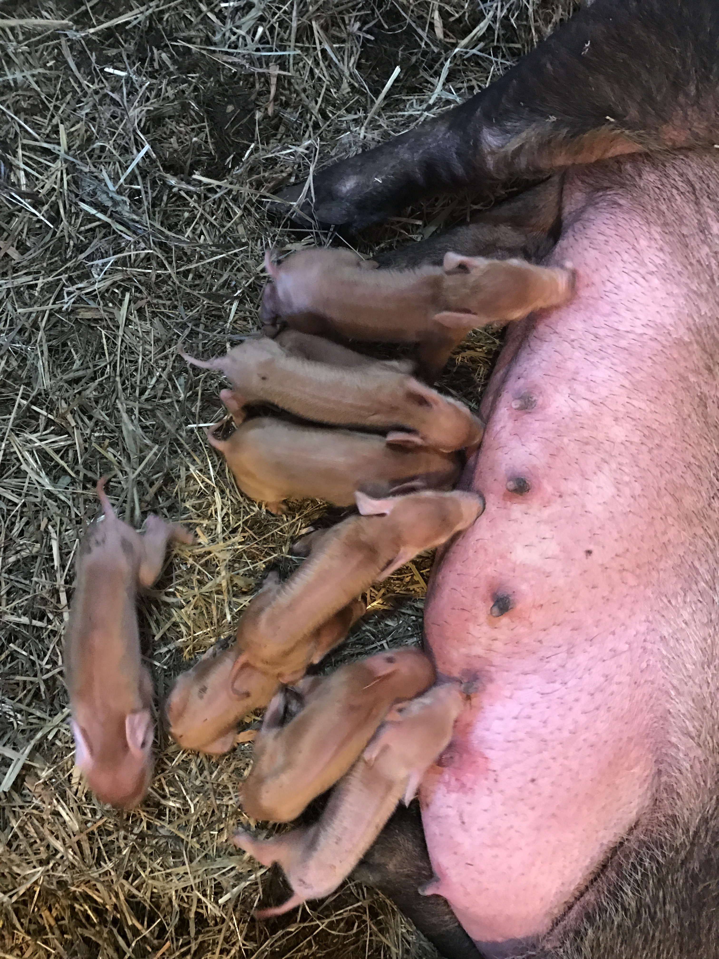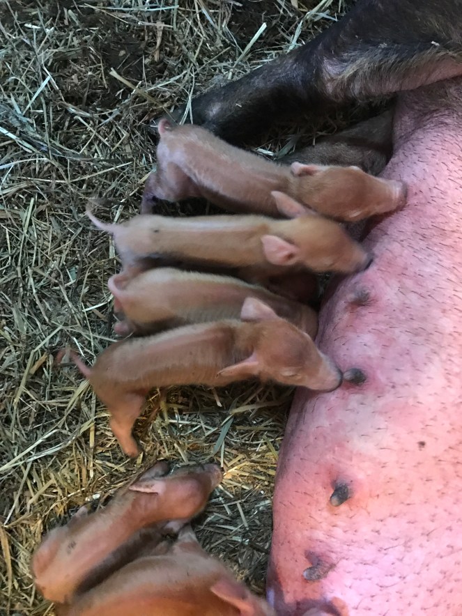 Rosie picked a nice warm day to have her piglets. But she didn’t wait for someone to help her. She decided to start popping them out in between the 2 times my husband checked on her!